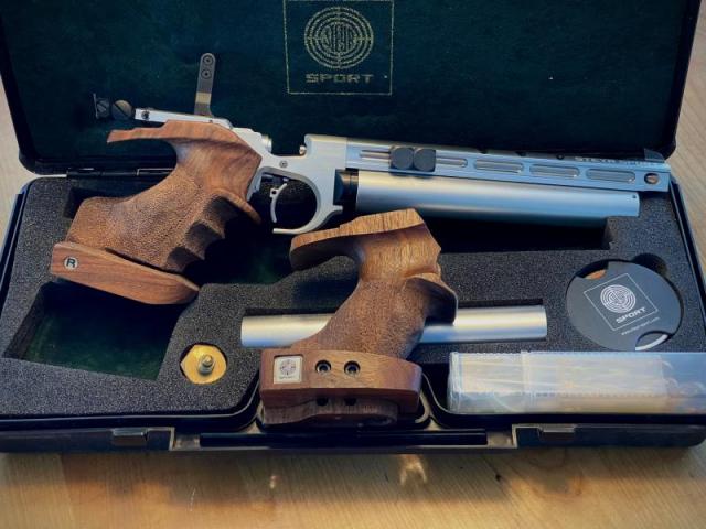 Steyr LP10 Evo mechanical from the first owner, bought in 2016 with two cartridges (expiration 03/2026), a handle from Steyr in size M, a custom handle from Rink (glove size 9 1/2), the compressed air adapter and the tools supplied, the instructions and the original case. Very nice condition with only very slight signs of wear, it works perfectly and breaks very nicely dry with a slight but clearly noticeable advantage at around 540g (everything can be easily adjusted). It has brought me over 270 competition rings several times but since the pandemic the pistol has hardly been fired. Today I prefer to concentrate on the firearm disciplines, which is why I am offering the air pistol here. Guarantee and warranty are not excluded. However, if a significant material defect in the article that I have not mentioned becomes apparent after receipt, I will take the article back within 14 days against payment of the return costs. Significant defects include cosmetic or age-related defects such as the following: aged seals, dried-in lubrication, color variations in paintwork, coatings or wooden parts, shrunken rubber, etc.