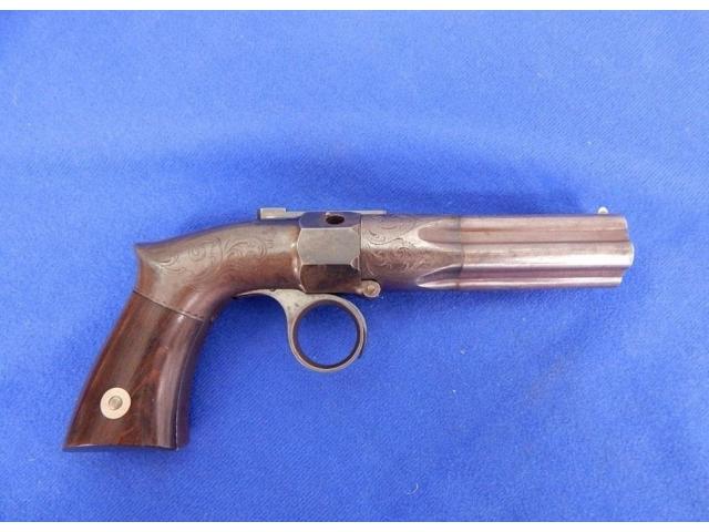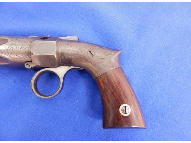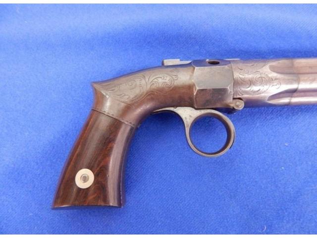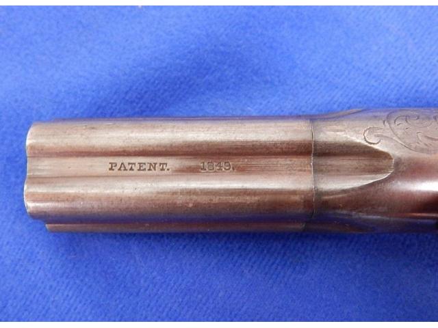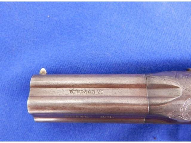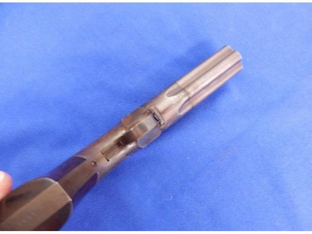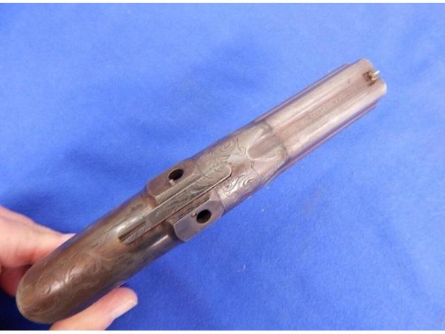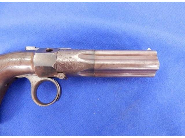 You are viewing an Original, Antique 1850s Pre Civil War 28 Caliber Pepperbox. Measures 8" overall and remains in Very Fine condition. Serial #22x. All markings are present and actions are fine. Barrels retain much of the original brown finish. Frame retains some blue. Ring trigger has case color. Wood grips are excellent. Made circa 1851-54.