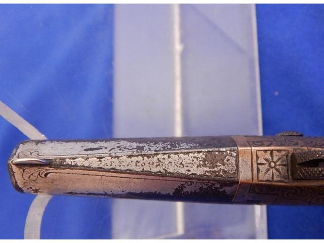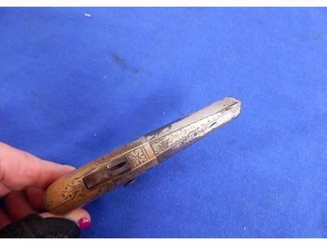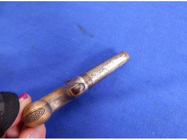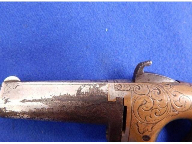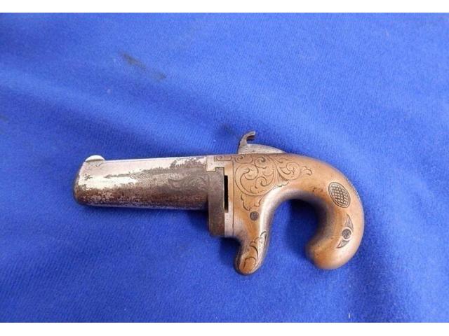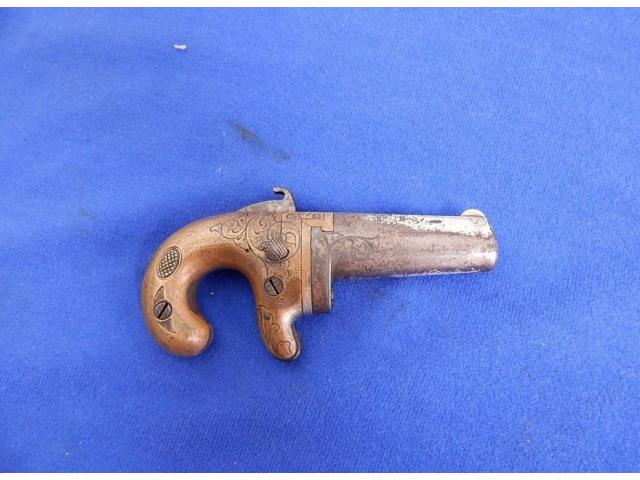 Antique 1860s Moore M1 41 Caliber Derringer. Measures 5" overall and is in Fine condition. Barrel retains around 35-40% silver finish. All markings are present. Bore and actions are fine. Barrel is marked B.Kittredge & Co. Cin. O (dealer). Made circa 1860s by maker Moore’s Patent Firearms Co.
