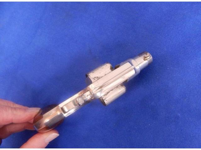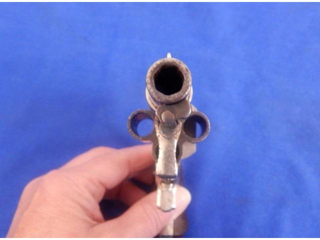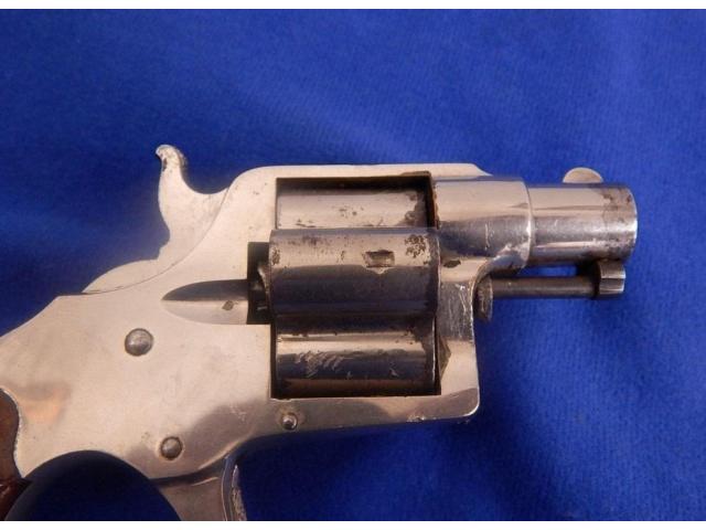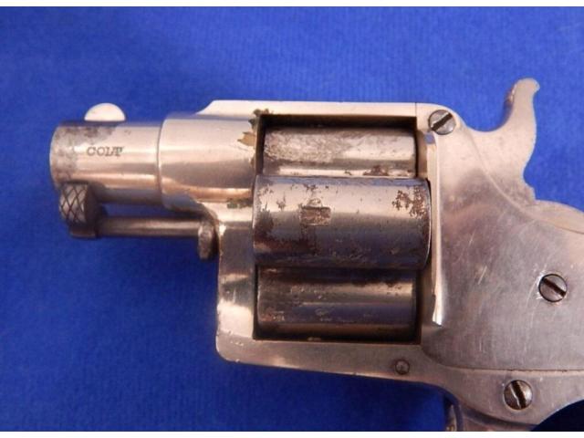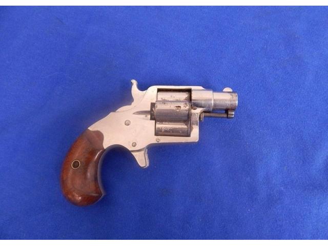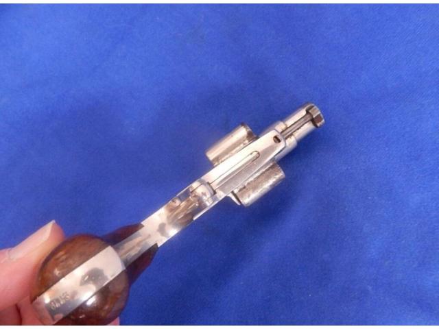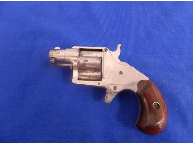 Pistol measures 6" overall with 1-1/2″ barrel. All markings are present. Bore and actions are fine. Metal retains around 85% nickel finish. Cylinder has what looks to be some vice marks. Wood grips are very fine. Examples with the short 1 1/2″ barrel werre manufactured in limited numbers. Made circa 1871-76.