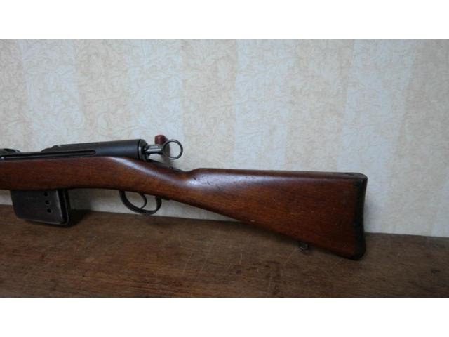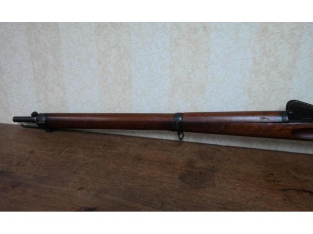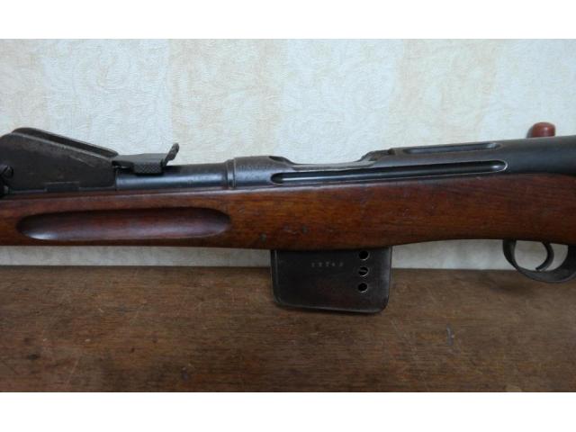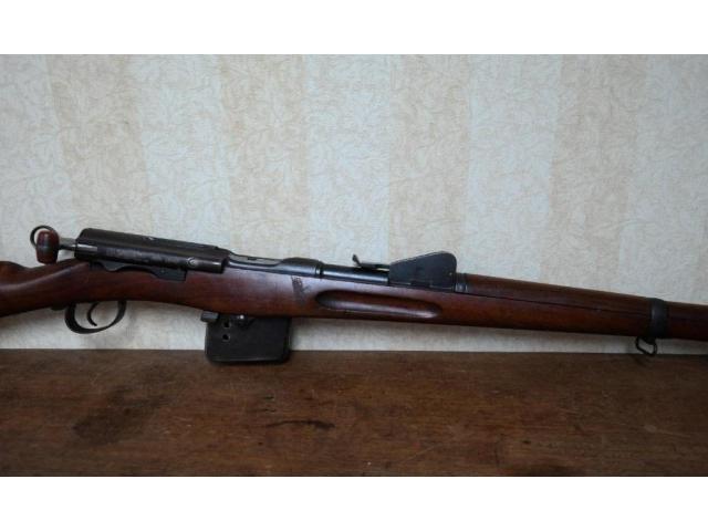 This is an antique 1889 Swiss Rubin chambered in 7.5x53.5 Manufactured By Waffenfabrik Bern. This rifle contains matching external serial numbers with the exception of the bolt and all original manufacturer markings. This 131 year old rifle is a Straight Pull action with original adjustable rear iron sights and Sling mounts on stock and barrel band.
