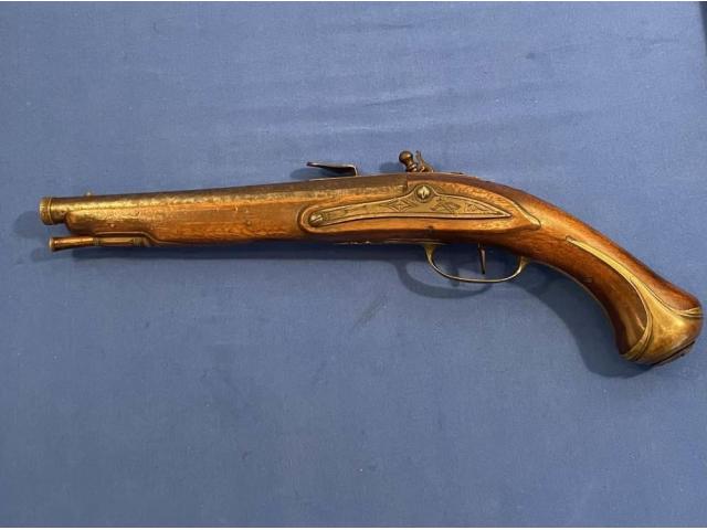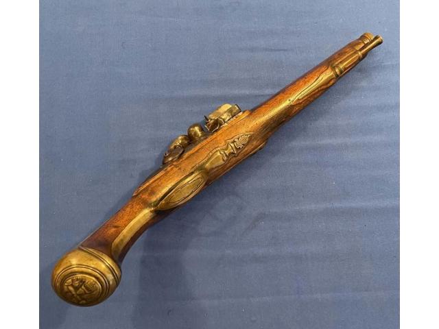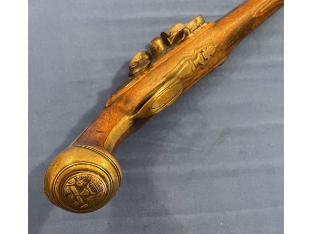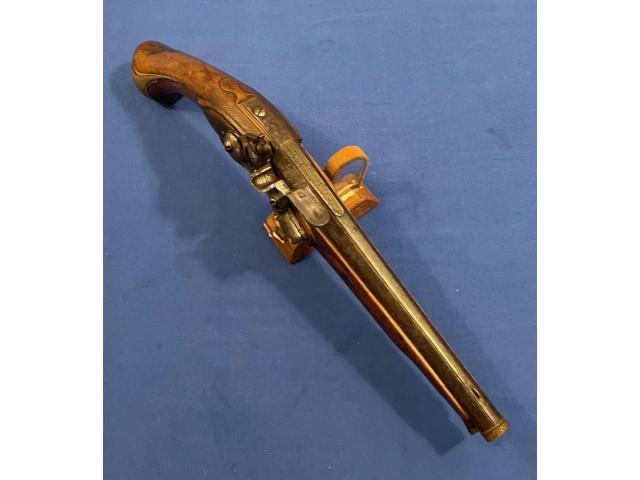 Offering for your consideration circa 1730s Dutch Colonial Flintlock Pistol. This nice circa 1730s pistol is .60 caliber has a 91/2 inch barrel and is 16 ½ inches overall. The pistol is in very nice untouched condition, metal is uncleaned as well as the wood is all intact and raised grain. The pistol is also mechanically sound and has its original ramrod. The lock is inscribed with DESELLES? and has brass fittings with a grotesque mask butt cap. Overall a really nice flintlock pistol with no issues. Has never been repaired nor modified whatsoever. This pistol dates to 1700-1730s and would have been used right into the French and Indian Wars and American Revolution. Buyer pays £25 shipping.