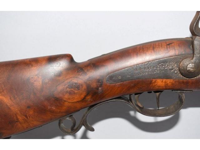 Rifle is sighted with a drift adjustable front blade and part of a tangent rear sight is present but incomplete. Lock is stamped “JJ Rieder/A. Interlaken” in rough block letters. Barrel features what appears to be a bayonet lug on the right front flat and the rifle is equipped with double triggers.