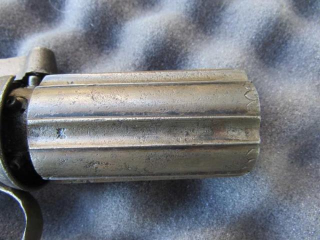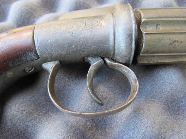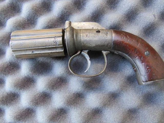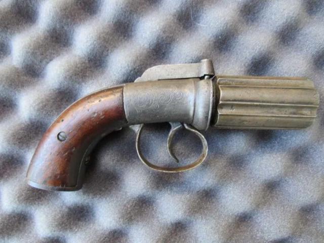This is an unreadable manufactured pepper box gun from the civil war era ther is a manufactures name on it -OU- ALL ,I cant make out the other letters. It is a percussion cap, ball and powder, pistol. If features very nice engraving around the receiver, trigger guard and hammer. The pistol overall finish is in decent shape, grips are nice and mechanically the pistol functions well. he cylinder catches slightly on one percussion nipple, all of which appear in good shape.