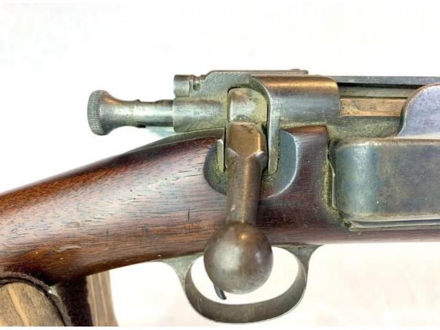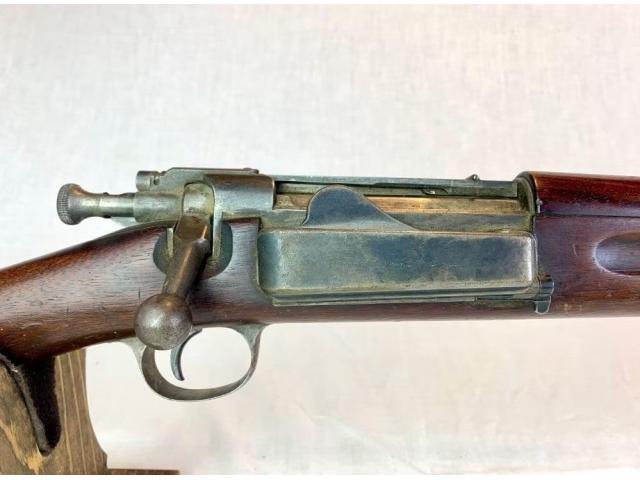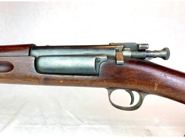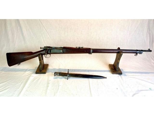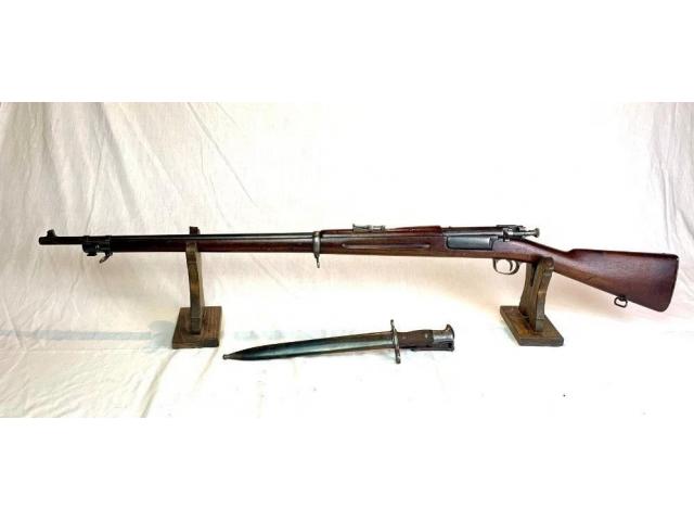 Antique Spanish-American War Era U.S. Springfield Model 1896 Krag-Jorgensen Rifle. Includes “US” and “1899” marked bayonet and scabbard. Rifle was manufactured in 1897. It has a visible “JSA/1897” cartouche. It is in fine condition with much of the original finish. The bore is bright with good rifling.
