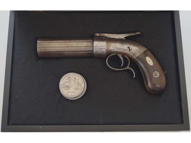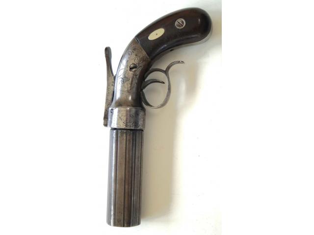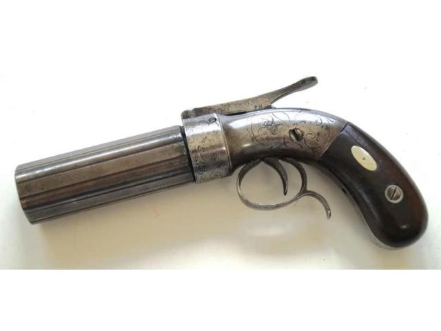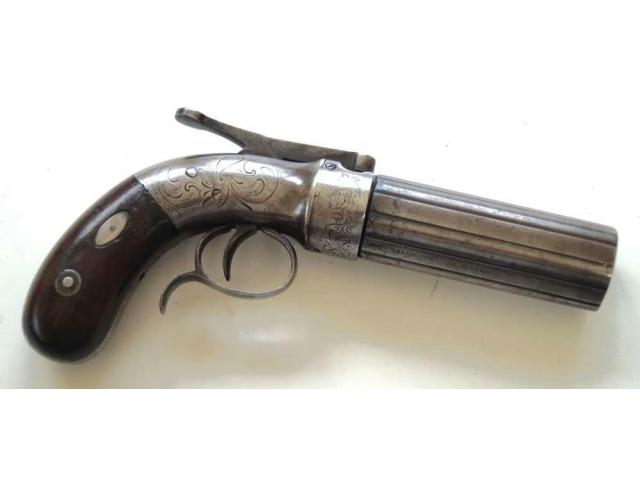 THIS IS A ANTIBELLUM ANTIQUE STOCKING & CO. PERCUSSION PEPPERBOX / BELLY GUN, .31 CAL. THE GUN IS IN VERY GOOD CONDITION, ALL ORIGINAL, GRAY PATINA THRU OUT, CLEAR ENGRAVING, ACTION IS EXCELLENT WITH STRONG LOCK UP, BORES ARE SMOOTH AND IN GOOD SHAPE,GRIPS IN GOOD CONDITION AND ARE DECORATED WITH GERMAN SILVER OVALS ON EACH PANEL. THEY DON'T COME BETTER THAN THIS.