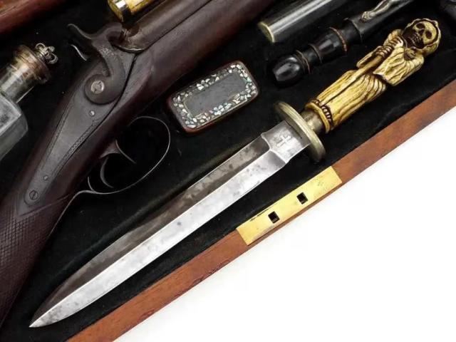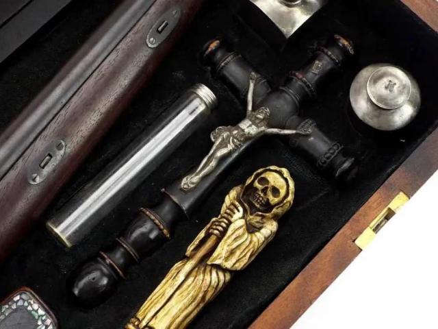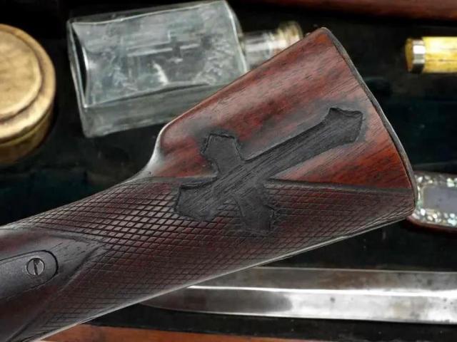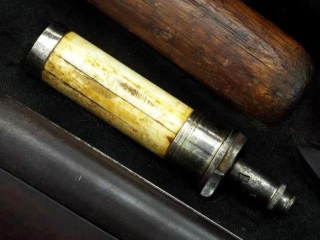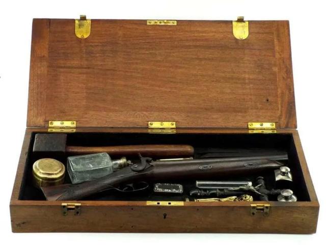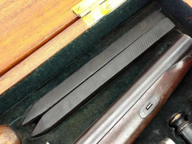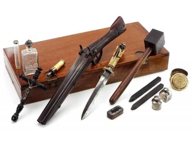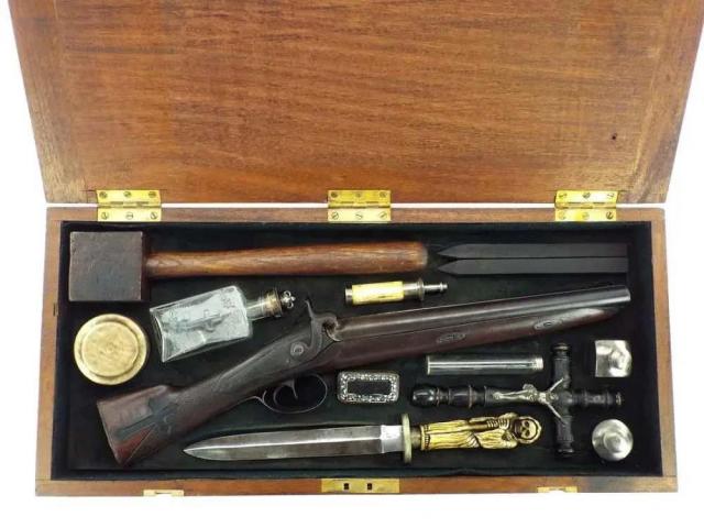 Here is a very unusual, amazing and very interesting collectible from the victorian era. It contains a variety of tools necessary for vampire elimination. Cut down double barrel percussion shotgun, wooden stakes, Hammer, Holy water bottle and silver knife along with other bottles and powder flask all functioning.