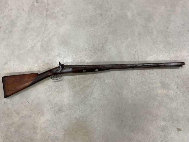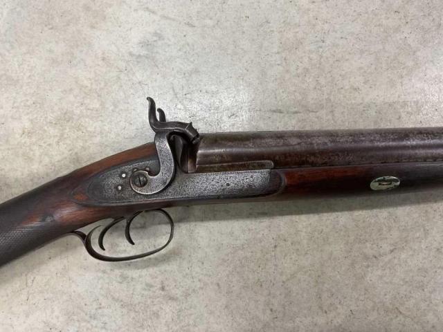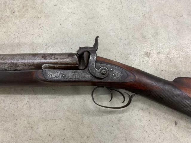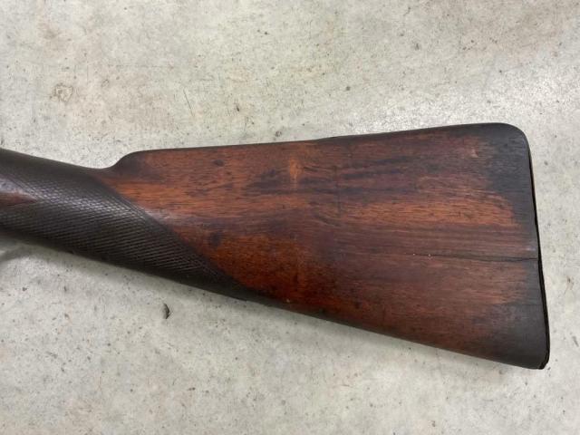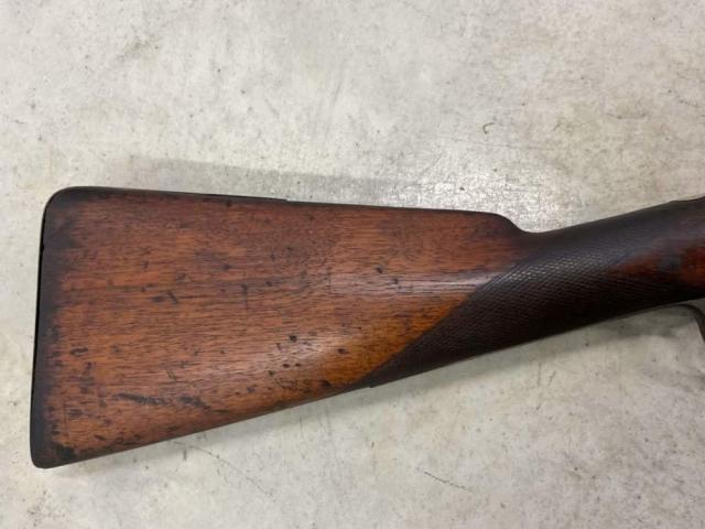 Antique W&H Bard Double Barrel 8 gauge blackpowder percussion shotgun. Made in England circa 1840S. 34” barrels with solid rib. Double tiggers and hammers. Factory engraved lock plates and hammers. Blued finishes. Wood has been lightly sanded/oiled. Checkered wrist. But plate is undersized, possible replacement. Wooden ramrod is present. CONDITION: Metal is a mixed patina throughout. Some cleaned surface rust on the barrels. Wood has wear and handling marks.