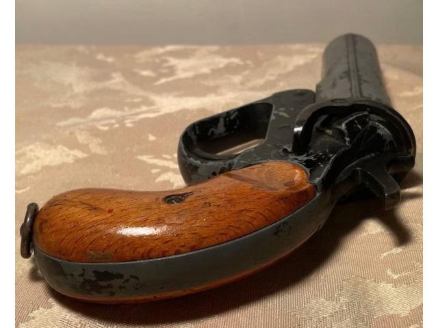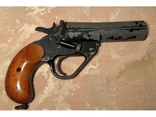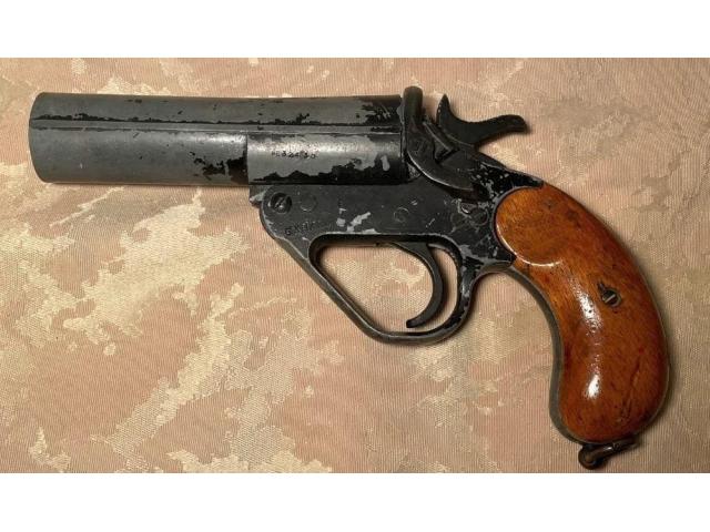 Up for sale is this Antique, Canadian Flare Gun that I believe was used in W.W. II. This piece is marked “CANADA” and serial number “32430”. The flare gun has a steel frame and wooden handle. The tube is non-magnetic. It is similar to a Webley & Scott No. 1 MKV but without barrel flare. For this flare gun’s use and history, it is in very good condition.