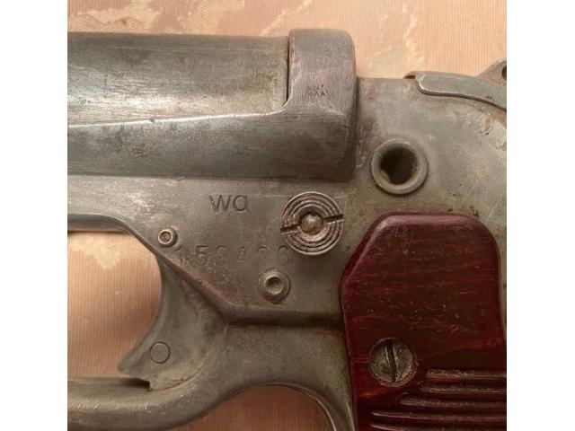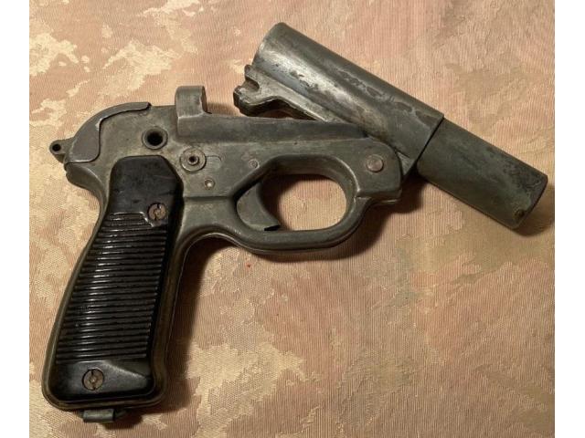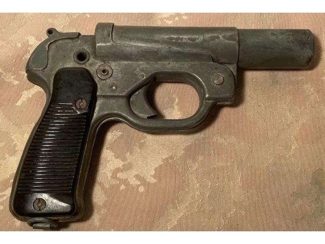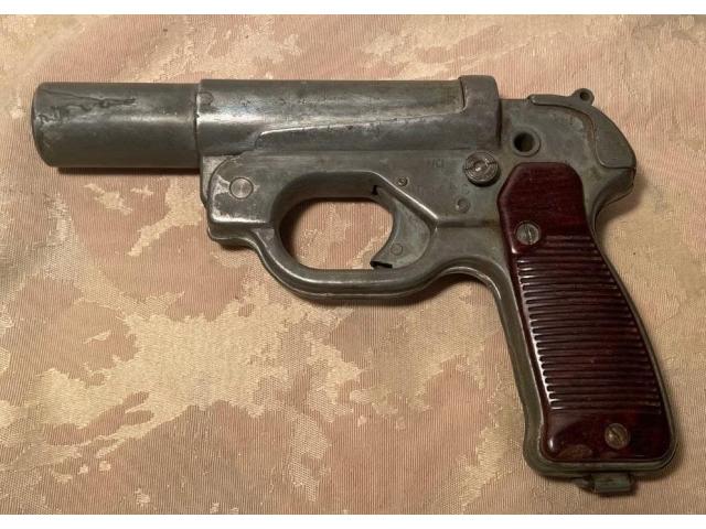 Up for sale is this Antique W.W. II. German Flare Pistol, Model LP42. The pistol has WA mark and serial number 159426 markings. It was made by Hugo Schneider AG Leipzig 05, Sachen, circa 1944. His code was WAA10. The pistol is single shot with smooth bore, 26.5 mm. This flare pistol is missing the firing pin. The grip has a small chip at the bottom. See pictures for details. For its age and history, this flare pistol is in very good condition.