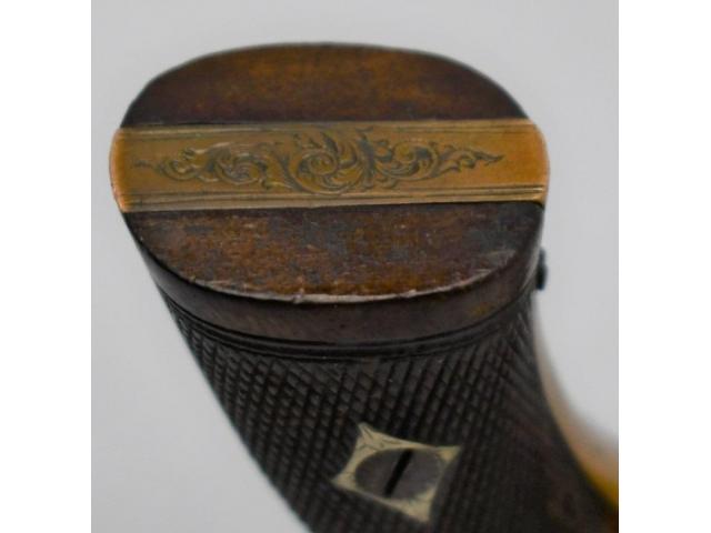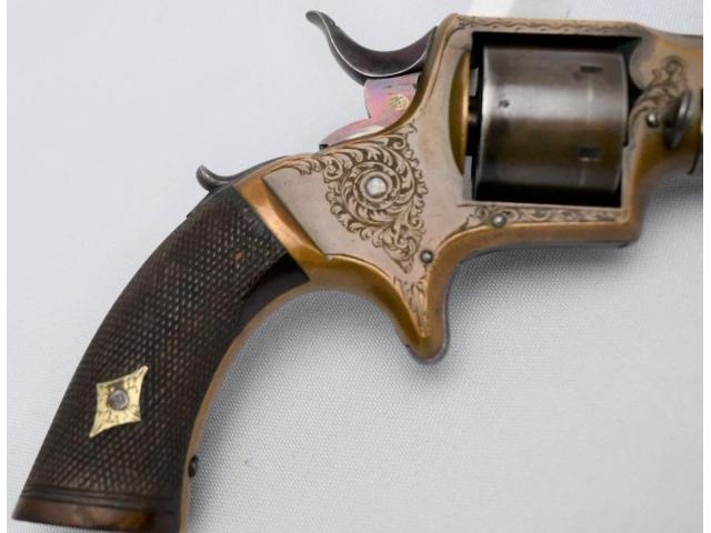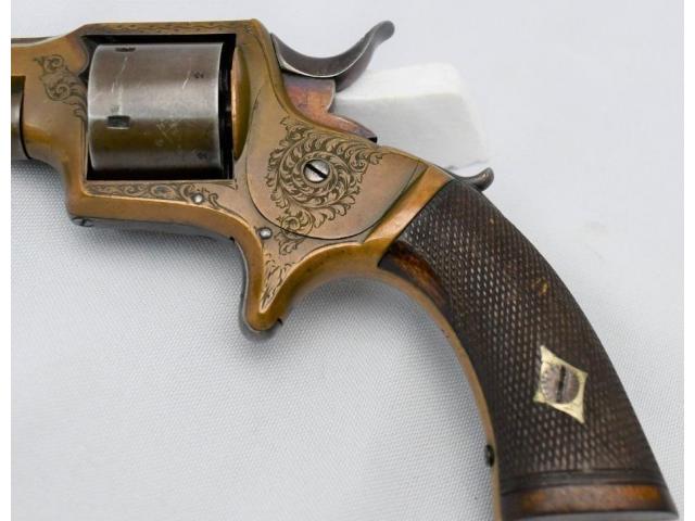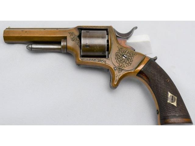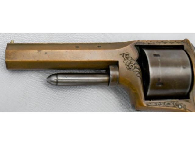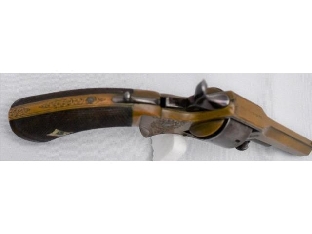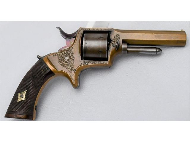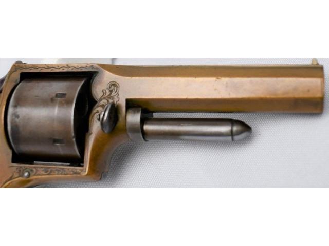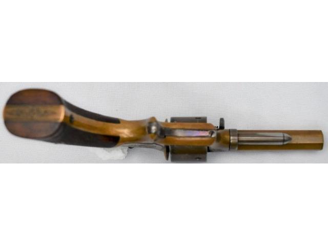Charles Osborne, Revolver, .32 RF, 2.75” Barrel, Brass Frame And Barrel, Six Shot, Single Action, Hammer Safety, Engraved, Combination Cylinder Pin / Fired Shell Punch, Checkered Grips, Serial # 7, Condition: Very Good Plus, with cylinder blue turning to patina, most of the fire blue remaining on hammer, Bore: Bright, with roughness toward muzzle. A very nice antique English pocket revolver.