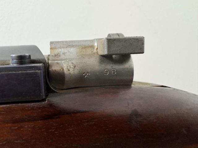 Serial number F8098 matches across receiver, bolt, stock, cleaning rod, and additional components. This rifle has a straight bolt handle, long 29-inch barrel, and classic military sights. Wood has original cartouches and shows expected field wear, but no major cracks or damage.