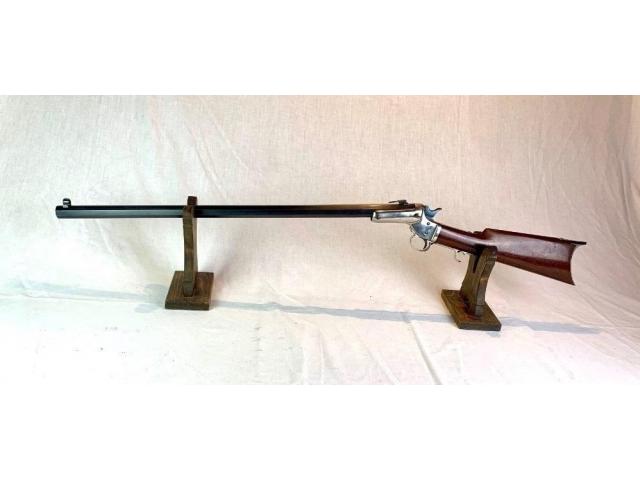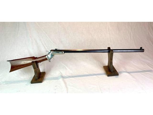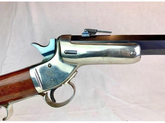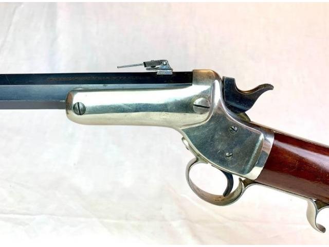 J. Stevens & Co. Tip-Up Single Shot Rifle. These rifles were first introduced in the 1870s and manufactured until about 1895. This one dates prior to the company name change in 1886. It is mechanically fine and in very fine condition with original finish and minor wear. The caliber is not marked but it appears to be 42 caliber. Please don’t hesitate to ask if you’d like additional info