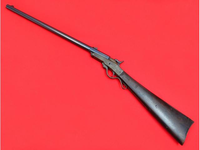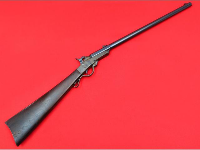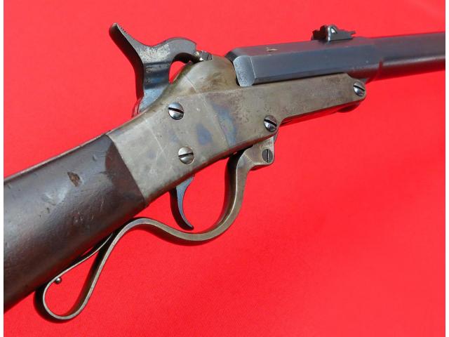 Here's a nice item for the U.S. military collector! This is an American Civil War era Maynard 2nd Model Carbine. Manufactured by the Massachusetts Arms Company in Chicopee Falls, NY, the Maynard is a breech loading single-shot which uses a unique .50 caliber metallic cartridge. The weapon has a conventional looking hammer with percussion cap arrangement which was used to ignite the charge in the metallic cartridge through a tiny hole in the base of the cartridge case. The barrel hinges open when the finger lever is lowered and the hammer is manually cocked. The barrel measures 20" in length and is fitted with a 3-leaf sight graduated for 100, 300 & 500 yards. There was no provision for a forearm on the Maynard which could cause trouble for the shooter when rapid firing due to barrel heating. The barrel is blued and the receiver case colored. The left side of the receiver was normally mounted with a bar & saddle ring but these have been removed from this example. This carbine is in very good condition and aside from the saddle bar, completely original. The left side of the barrel is marked with the "G.W.S." of U.S. Army sub-inspector G.W. Schuman. His initials also appear on the buttstock as do the "J.W." initials of final inspector James Mills. There are still some faded case colors visible on the frame mixed with some light patina/surface rust. The maker markings/patent dates are crisply struck on each side of the frame and the various parts have the typical single-letter military inspection marks. The serial number (12171) is marked on the lower tang. The barrel retains almost all of the original blue finish with a few small scattered spots of rust and associated light pitting. The buttstock is in very good shape showing various handling marks but free of cracks or chips and never sanded or refinished. The original inspector's markings on the left side are as crisp today as when they were struck 160 years ago. There is some corrosion to the buttplate with some cleaned pitting at the heel. Mechanically, this carbine is in excellent condition. The action works perfectly and locks up tight.