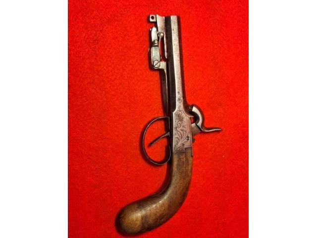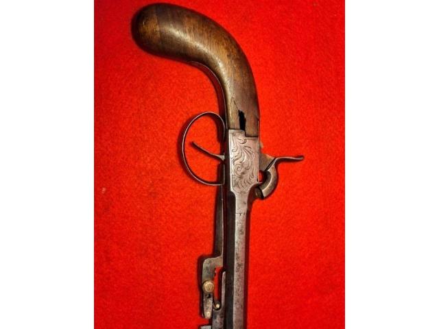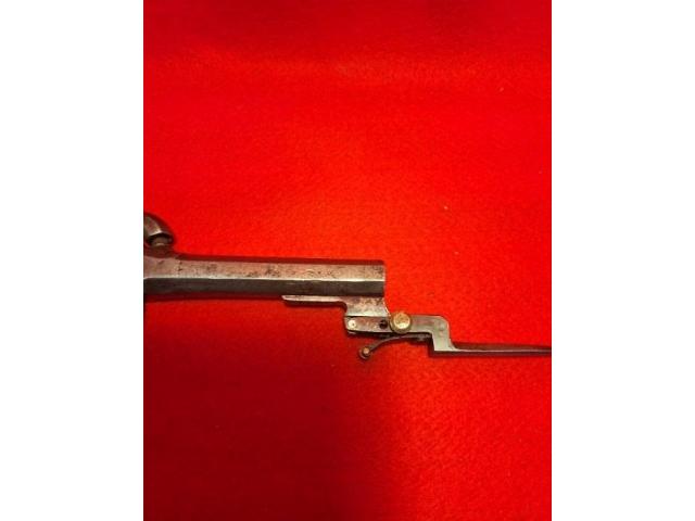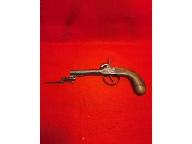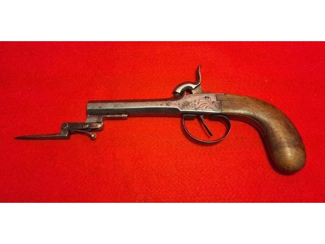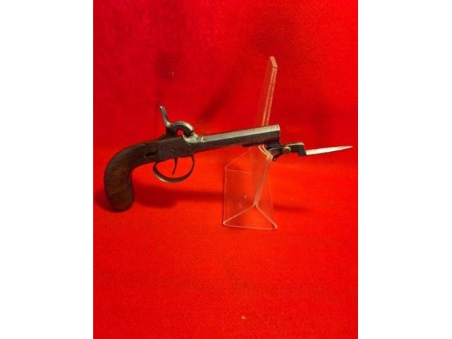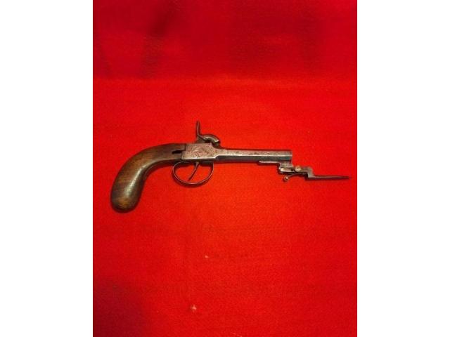 Here we have a super cool and rare example of a 50 cal boot gun with a swingout Bayonet. European or Belgium. The bayonet folds up tip goes underneath the trigger guard, pulling the trigger guard back releases it and it springs into action, if you miss with your first shot you can poke them in the eye really cool 1840s Highwaymen style boot gun. Metal is engraved nice patina no Maker's Marks to be seen definitely a piece for anybody's collection.