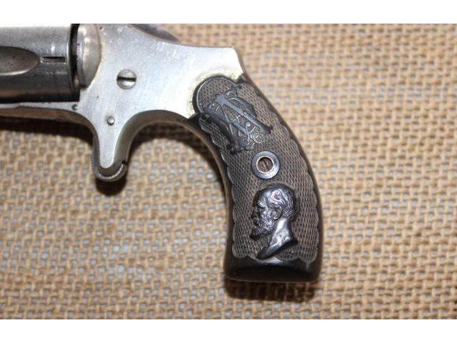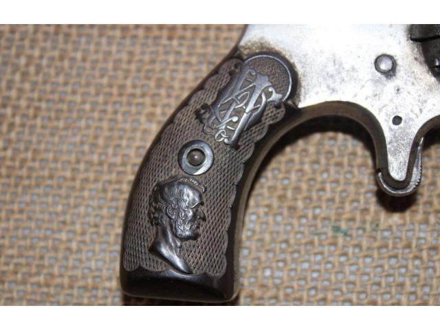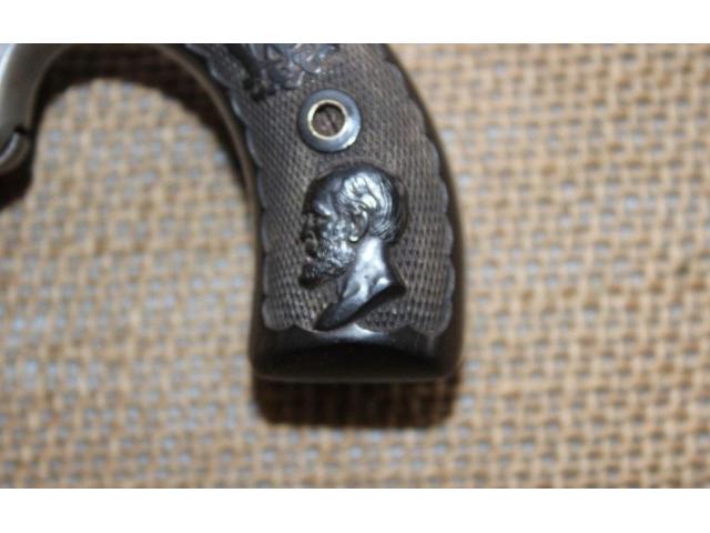 The Grips Represent 2 assonated Presidents. The hard rubber grips are monogrammed and have President Lincoln and President Garfield on them—two American Presidents who were assassinated. According to Flayderman, “There is an estimate of a few thousand total production” of this revolver.