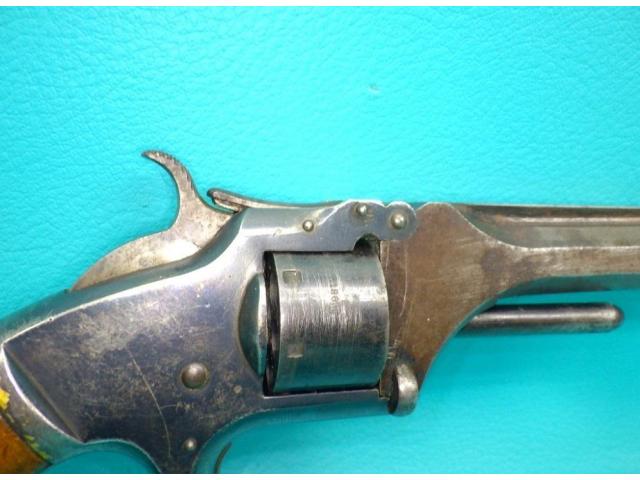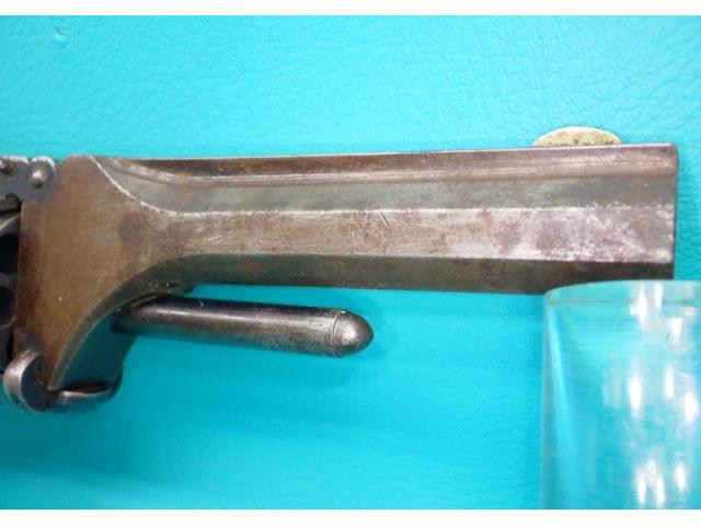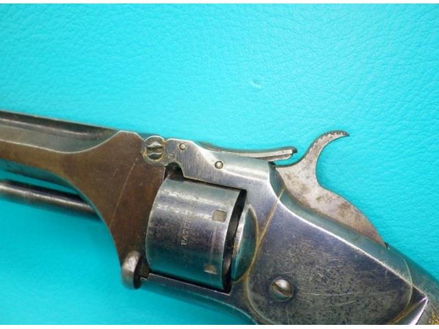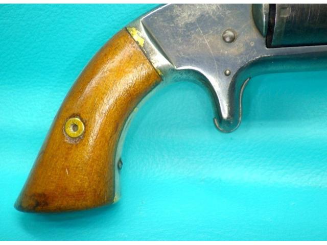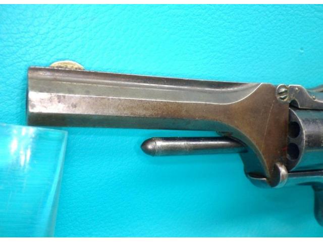 Features: 7 shot non fluted cylinder, silver plated brass tip up frame, octagonal barrel, and spur trigger.