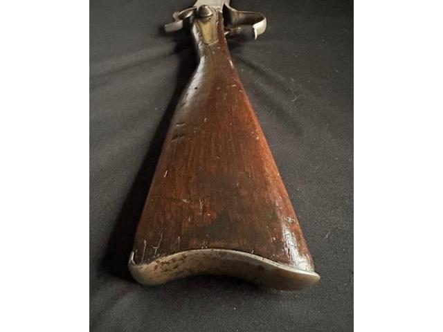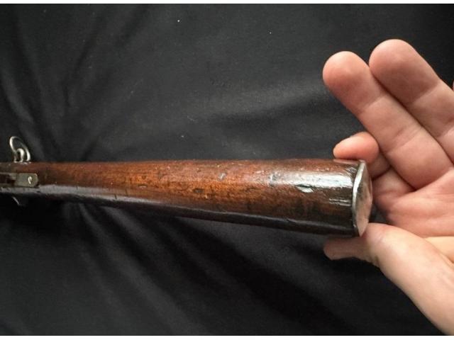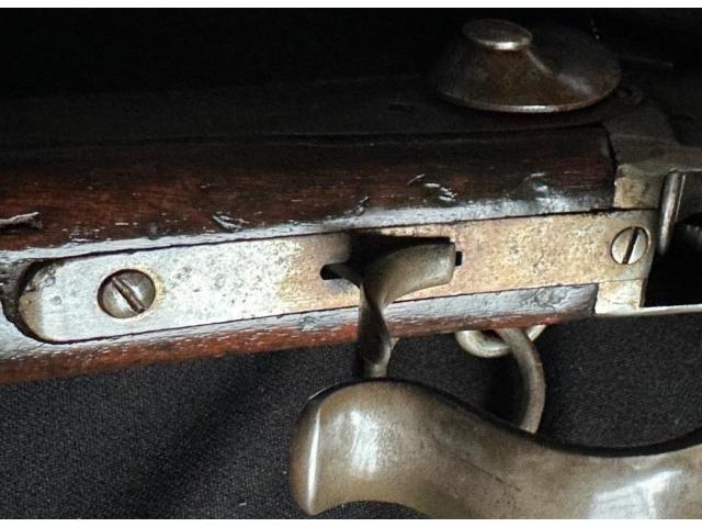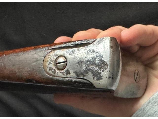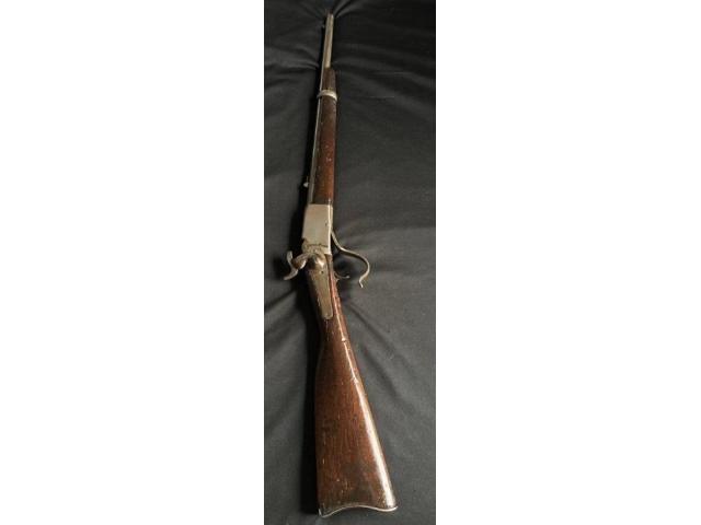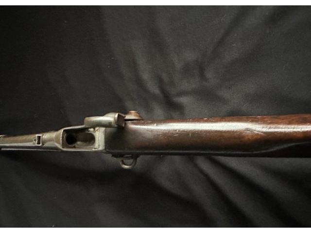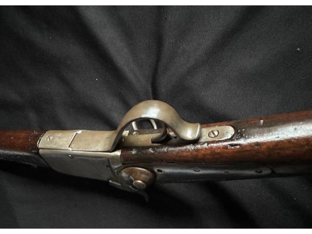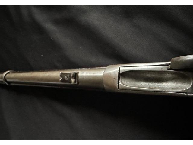 Antique Peabody Breechloading Carbine, by Providence (RI) Tool Co., NVSN, .50 RF cal., 20" round barrel, block-blade front and single-leaf rear sights; 4" receiver marked only "E" at top has serpentine trigger guard/operating lever, 5.25" back-action lockplate with military hammer, left-side sling ring/mount. Oil-finished forend has a single spring-retained band (marked "N"), matching buttstock with carbine buttplate. Mfg'd ca. 1866-71. Condition is good retaining no original finishes, being bright metal lacking all markings due to polishing.