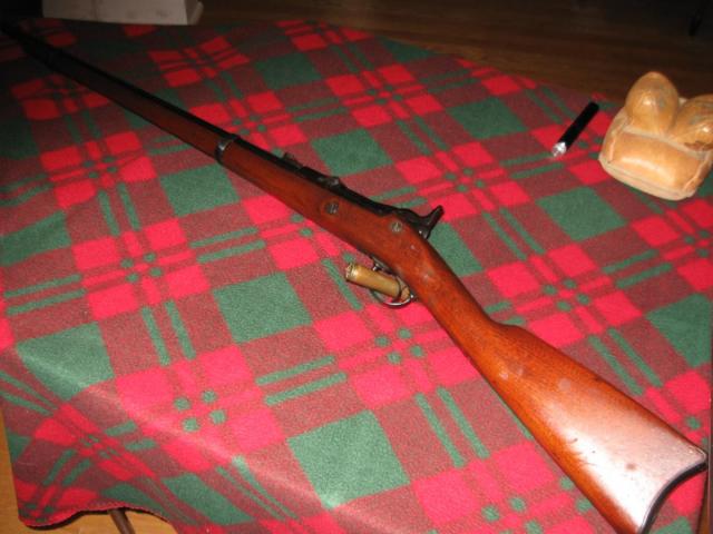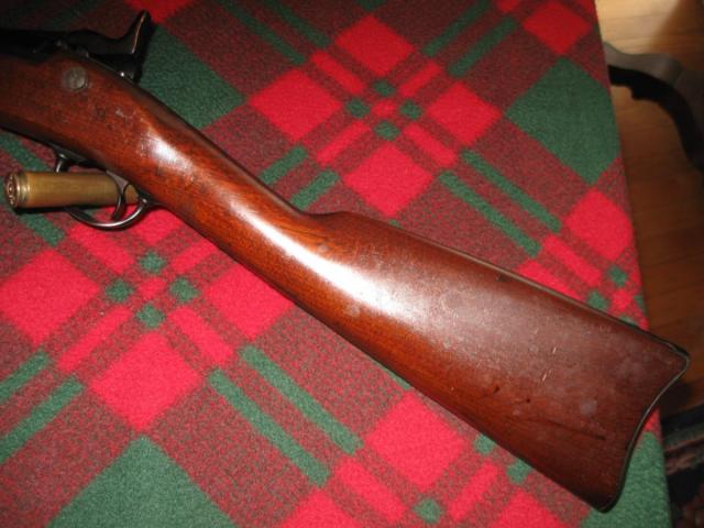 THIS AD IS FOR A U.S. SPRINGFIELD CADET RIFLE IN CALIBER .50-70 GOVERNMENT. THIS IS A SHORTENED VERSION OF THE MODEL 1868 RIFLE. THE CADET LENGTH OF BARREL IS 3 INCHES SHORTER THAN THE RIFLE AT 29.6 INCHES. ALSO THE STOCK THICKNESS AROUND THE BARREL SHOWS IT TO BE CONSIDERABLY THINNER THAN THAT OF THE RIFLE. MOST OF THE 3,400 CADET RIFLES PRODUCED WERE MADE BETWEEN APRIL AND SEPTEMBER 1871. NICE SHINY BORE WITH GOOD RIFLING AND SOME LIGHT PITTING. SERIAL NUMBER ON BARREL IS 1011 AND SERIAL NUMBER ON RECEIVER IS 1339.