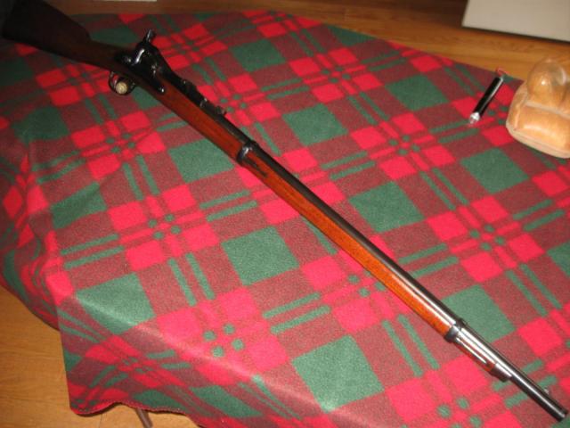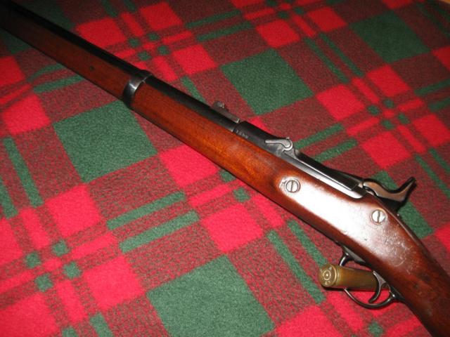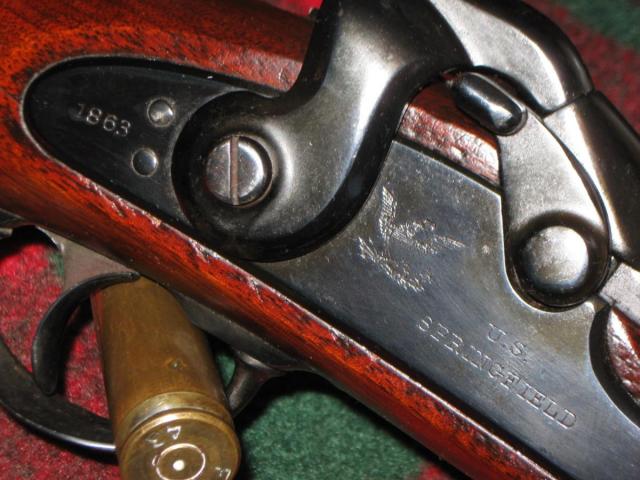 SPECIFICATIONS: OVERALL LENGTH IS 48.8 INCHES, BARREL LENGTH (IN BORE) 29.6 INCHES, RIFLING IS 3 LANDS AND GROOVES, CALIBER IS 45-70 GOVERNMENT, 2 CLAMP TYPE BARREL BANDS ~15 5/8 INCHES APART, BREECH BLOCK STAMPED 1870/EAGLE/ARROWS/U.S., LOCK PLATE DATED 1863, NO V/P/EAGLE/P STAMP, REAR SIGHT M68 DEEP V, FRONT SIGHT 1 1/4 INCH FROM MUZZLE AND 5/16 INCHES LONG, NO SLING SWIVELS AND WALNUT STOCK. LADDER PART OF REAR SIGHT IS MISSING, HAIRLINE CRACK ~2 INCHES ON LEFT SIDE OF RECEIVER FROM FRONT TO FIRST RECEIVER SCREW, NO CLEANING ROD, NO RESISTENCE ON TRIGGER RETURN SPRING, STRONG HAMMER AND HOLDS ON FIRST AND SECOND NOTCH.