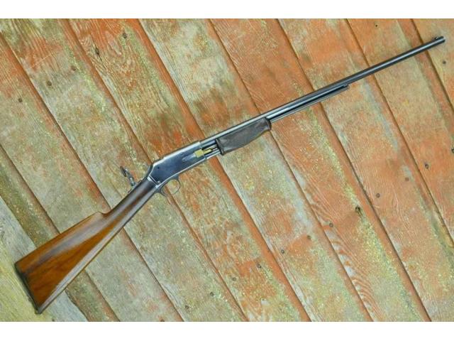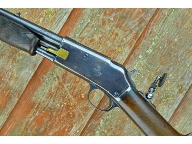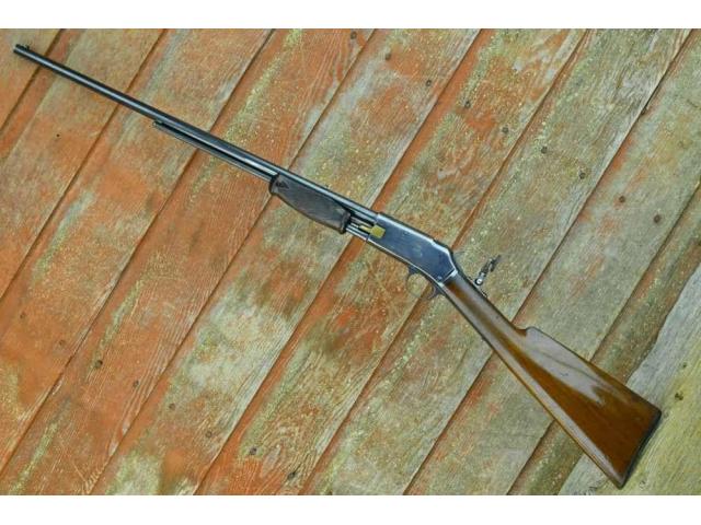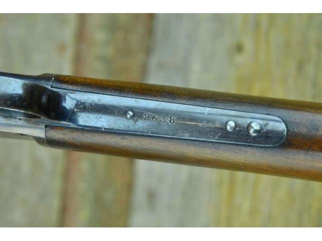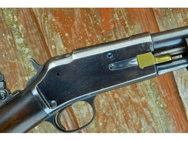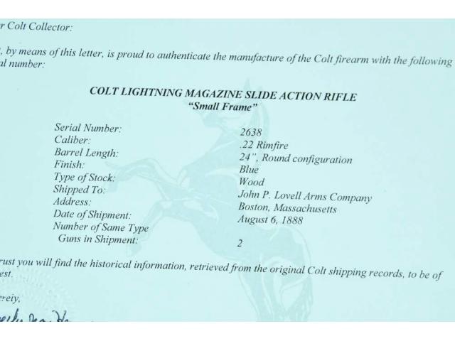 One of the best antique Colt Lightning small frame rifles I have ever had the pleasure of offering. Made in 1888 chambered in .22 rimfire. 24" round barrel, 2/3 magazine. Shipped to the John P. Lovell Arms Company on August 6th, 1888. The receiver has a lot of nice original blue with some turning a light patina. The barrel and magazine tube are also a nice original blue with some turned to a plum patina and have some handling wear. The bore is very good with only light roughness - way above average. The wood is very good as well. The action locks up tight and is very crisp. Stocks are good with the forend handle having a couple of small chips. A fine old lightning! Ships fully insured and will be packaged very well.