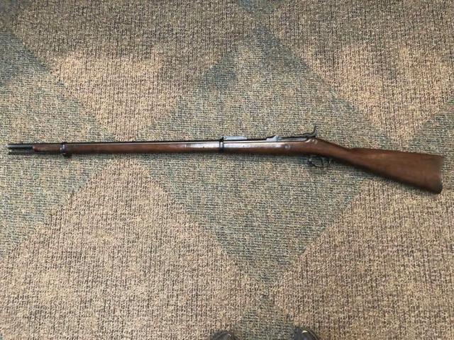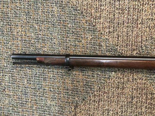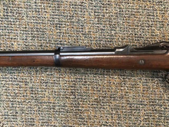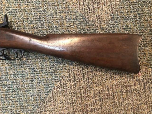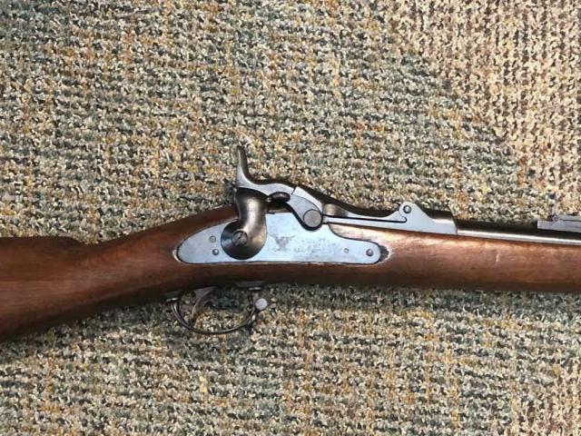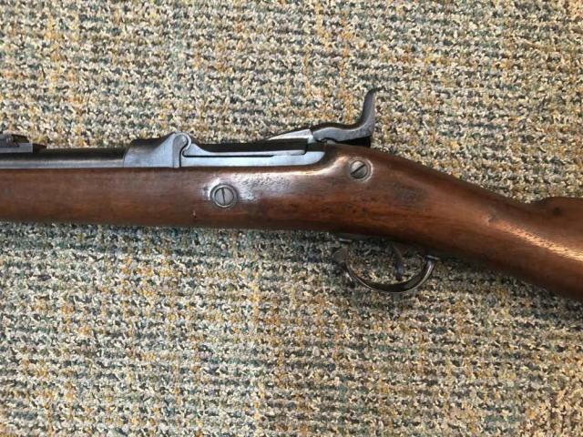 1878 Trapdoor rifle. Overall in good to very good condition. Bore is bright and shiny, strong rifling with a few dark or rough patches,. Cartouche appears to be 1884. Has split on left of stock at muzzle. Shows normal wear and handling. Has been re-blued with some pitting showing through.