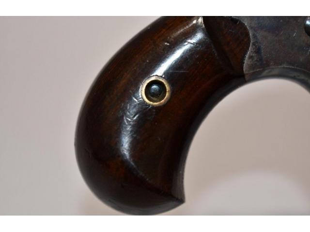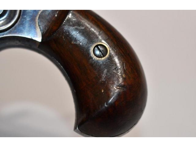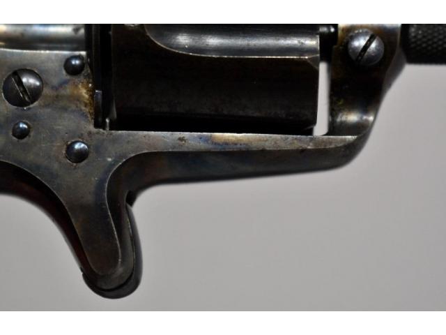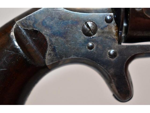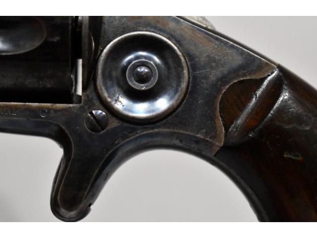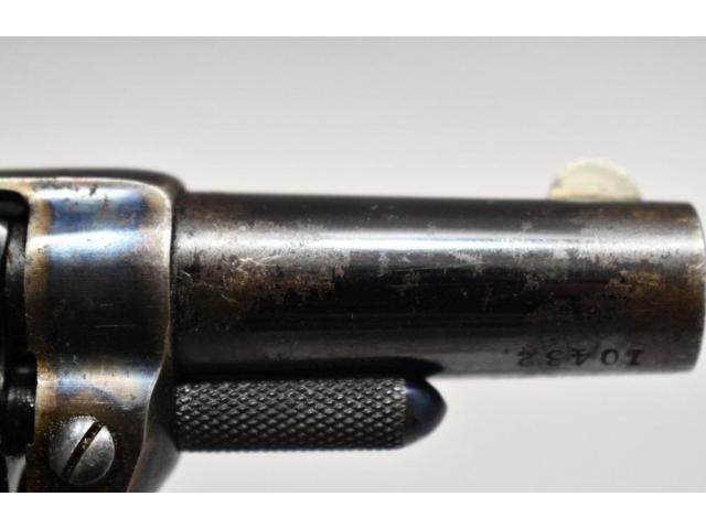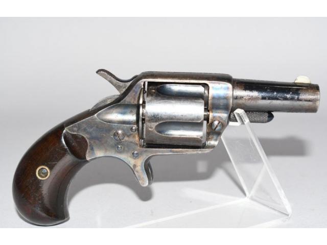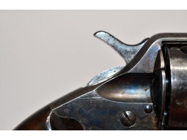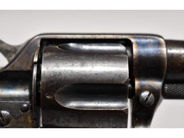 Up for sale is a wonderful, antique Colt New Line 41 single action revolver chambered in 41 Centerfire. Round barrel measures 2 1/4" in length with a bright, strong mostly very good bore with some streaks of light frosting and faint pinprick pitting near the muzzle. Revolver retains about 80% original blued and case colored finish with some areas of flaking, scattered handling marks, high edge wear, freckling and some brown toning. Exposed areas that have flaked have toned mostly a soft brown-gray patina. Smooth wood grips show scratches and dings with some points of flaking but remain in very good condition. Revolver is sighted with a small half round German silver front blade. Etched marking on the left side of the barrel remains clear, as does the serial and patent on the underside of the barrel and address marking on the top. Lower left side of the frame below the cylinder is clearly marked "41 Cal" followed by a "C" for centerfire and the frame serial is under the left grip. Back of the cylinder is stamped with the last two digits of the serial and the end of each cylinder flute shows a tiny proof mark.
