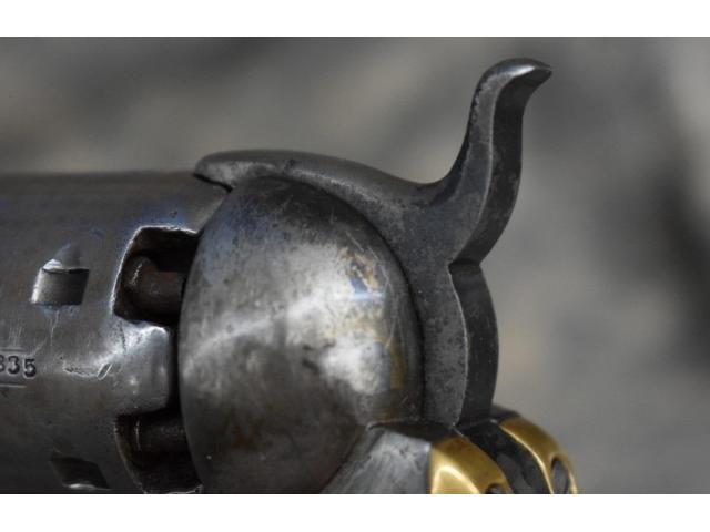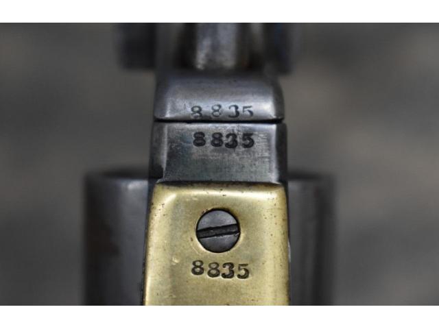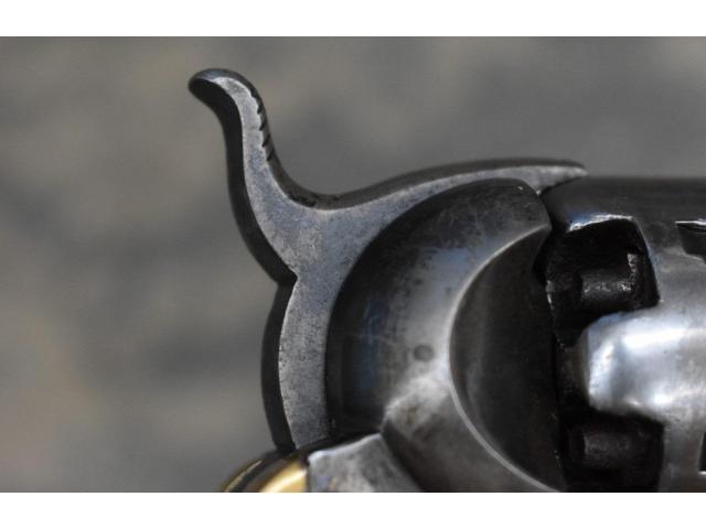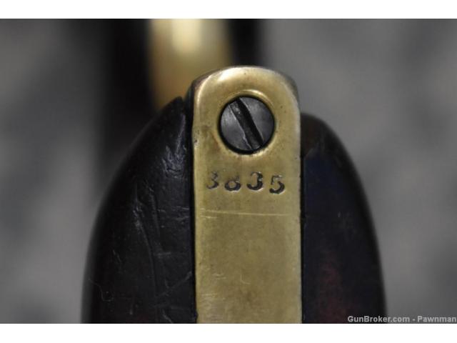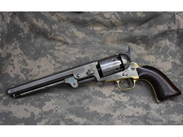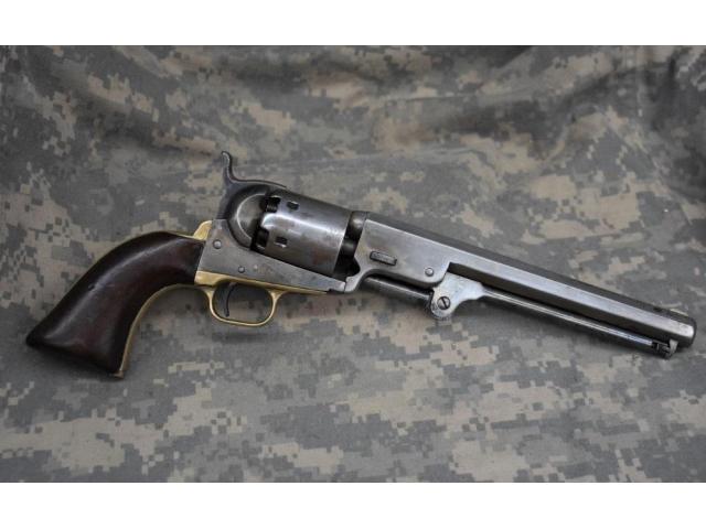 This is a Colt Model 1851 “Navy” Revolver 3rd Model, made in 1851. This antique .36 caliber percussion revolver has all matching numbers on the frame, barrel, cylinder, and both halves of the brass grips. It is in good condition for a 169-year-old pistol with strong springs, good timing, proper rotation of the cylinder, and good lock-up. The finish and the Naval scene have been worn away to a grey patina, and the grips have compressions and a small missing chip from the left front panel as shown. The bore is dark with pitting as shown. A nice example of a mainstay of the Civil War & the American West!