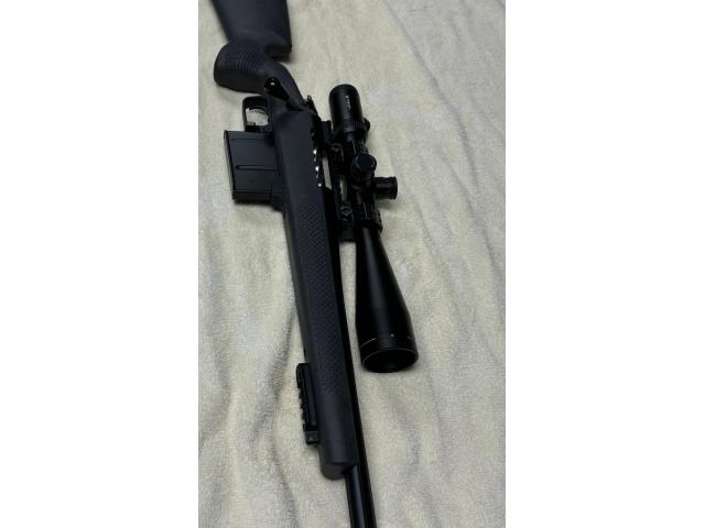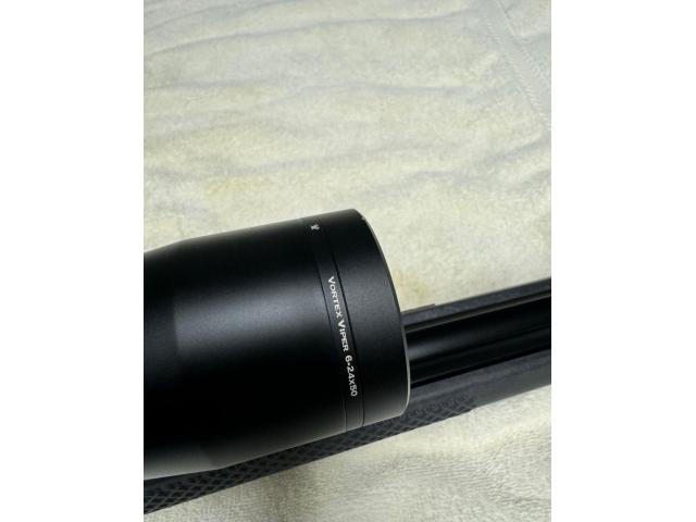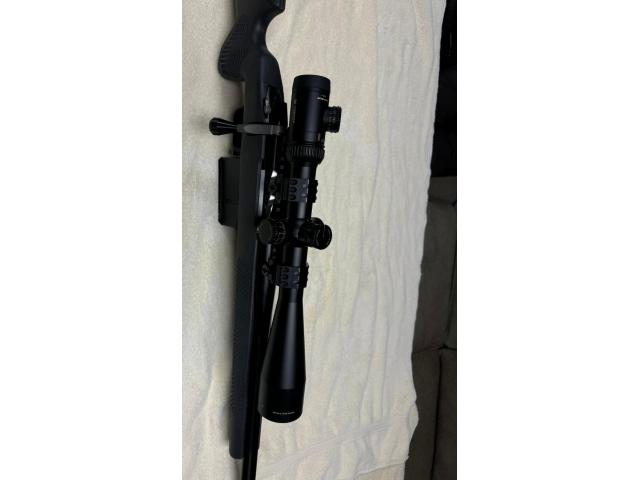 ScopeRemington custom shop barreled action with deep 3 flute barrel, Pacific tool and guage one piece fluited bolt with lightweight firing pin, seekins precision stock with qd flush cups, seekins precision scope rail, Bix n Andy trigger set at 1.5# (adjustable), greyboe detachable bottom metal and MM self timing 3 port brake. Vortex viper 6-24x 50 1/4 moa Less than one box through the gun!