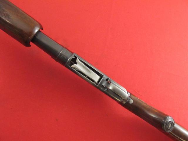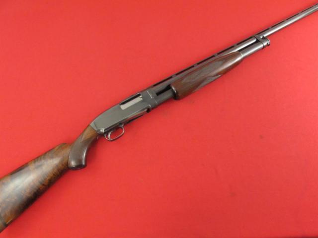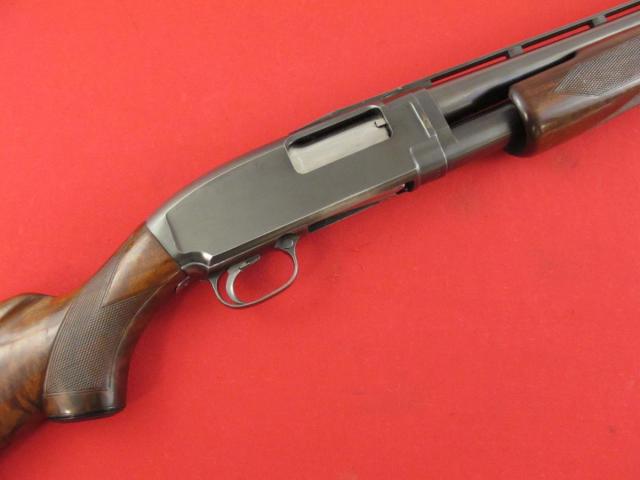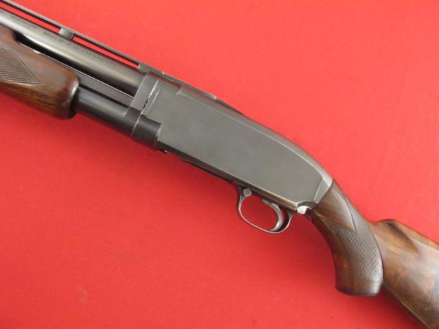This is a Pre-64 Winchester Model 12 pump action shotgun in 12ga. It was manufactured in 1951, and sports a 30" vent rib barrel with a fixed full choke. The finish shows some sharp edge wear and some light handling marks. The checkered stock and forearm show a few light dings and surface scratches. The wood shows beautiful grain. The bore is nice and shiny. A Decelerator buttpad has been added with a 13.5" length of pull. It is 12.5" to the end of the wood. The bore is nice and shiny.