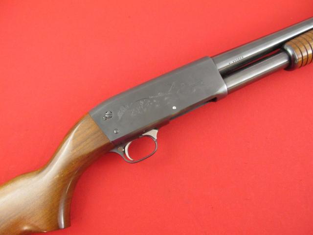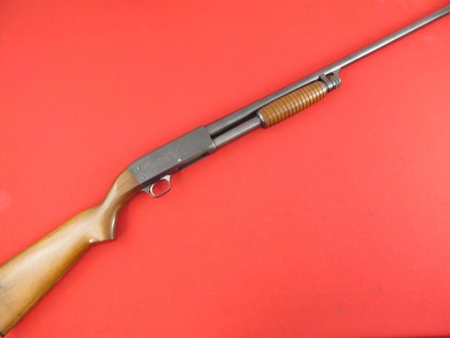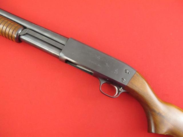 This is an Ithaca Model 37 Featherlight pump shotgun in 12ga. It was manufactured in 1962. It is a blued with a 30" barrel, chambered for 2 3/4" shells with a fixed full choke. It is in good shape showing a few light handling marks