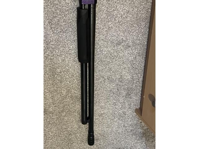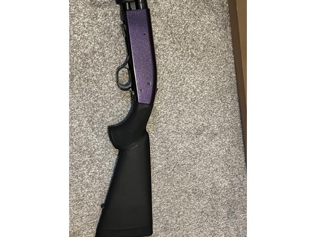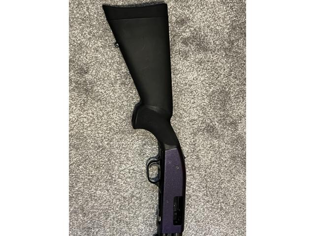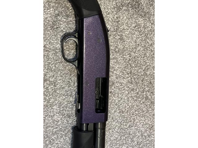 Nice condition pump action shotgun. Painted metallic purple by previous owner. Presentable job. Fitted with Hogue plastic furniture (wooden stock and friend come with gun)